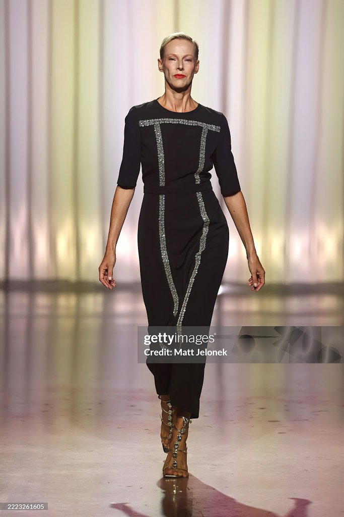 BERLIN, GERMANY - JULY 02: A model walks the runway at the COLLECTIVEFOUR Marcel Ostertag fashion show during Berlin Fashion Week SS26 at Uber Arena on July 02, 2025 in Berlin, Germany. (Photo by Matt Jelonek/Getty Images for Marcel Ostertag)
